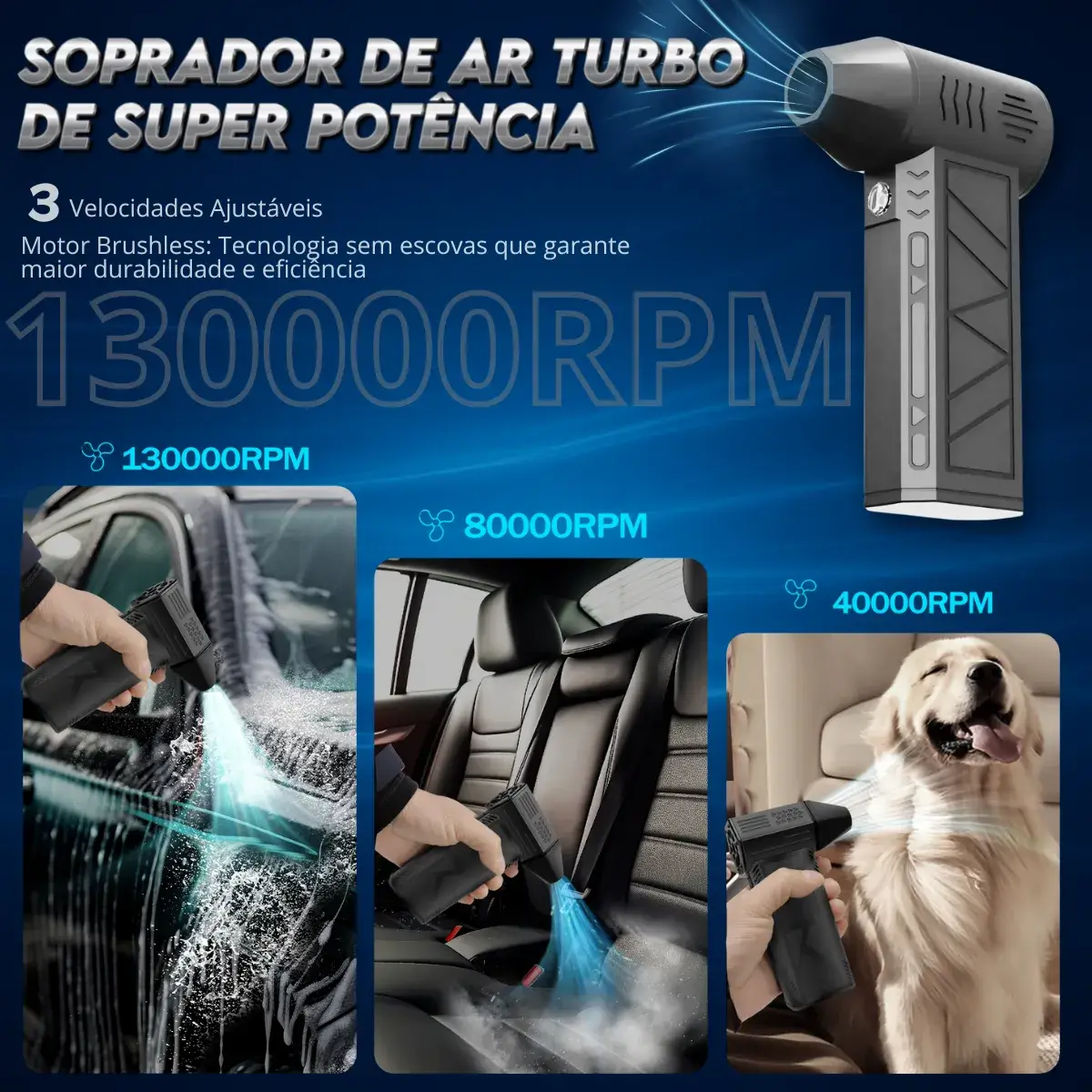 Apresentamos o Mini Soprador Secador Turbo Jet Fan, a escolha perfeita para quem busca eficiência e praticidade nas tarefas de limpeza e manutenção. Com impressionantes 13.000 W de potência e uma velocidade de sopro de até 270 km/h, este equipamento garante resultados rápidos e eficazes em qualquer ambiente — seja no jardim, garagem, espaços externos, veículos ou em equipamentos delicados.